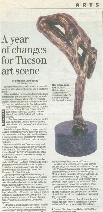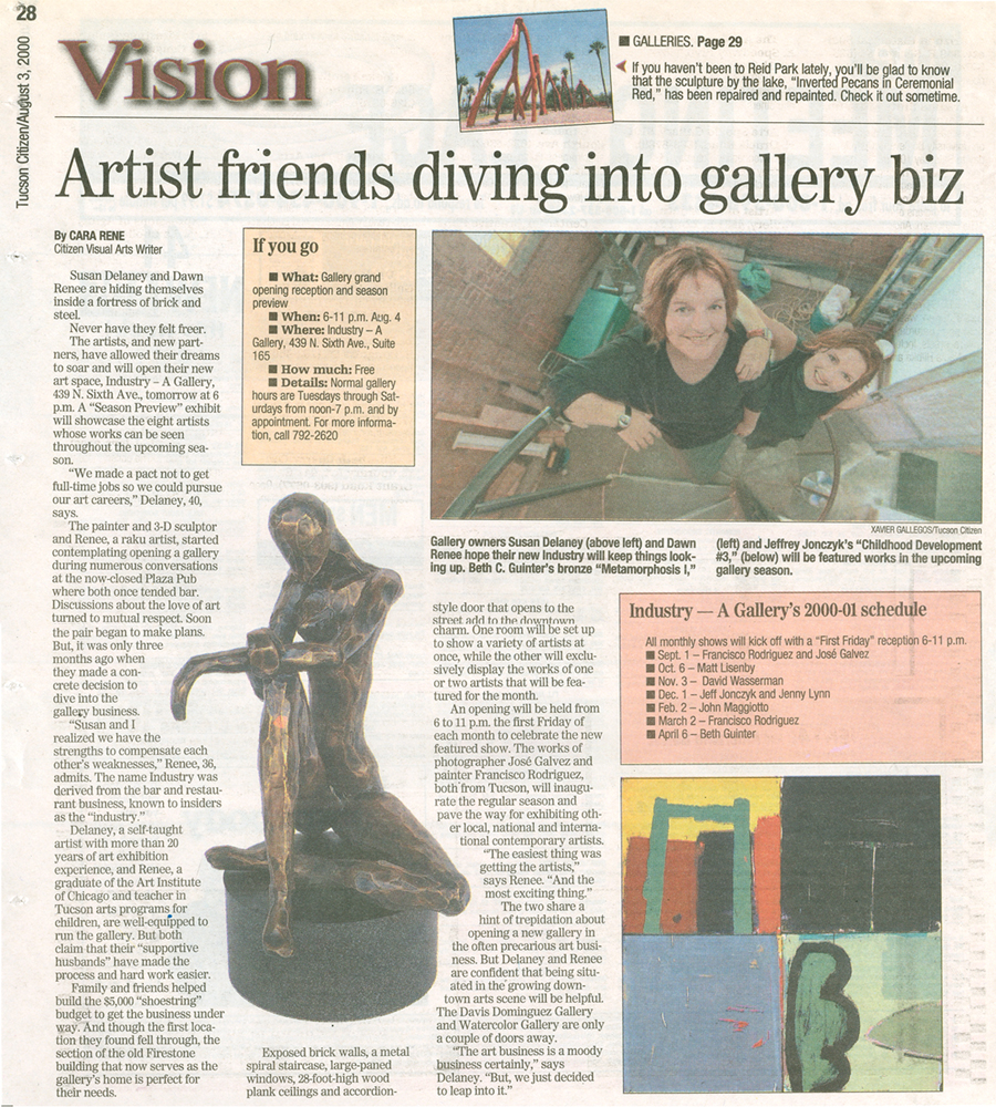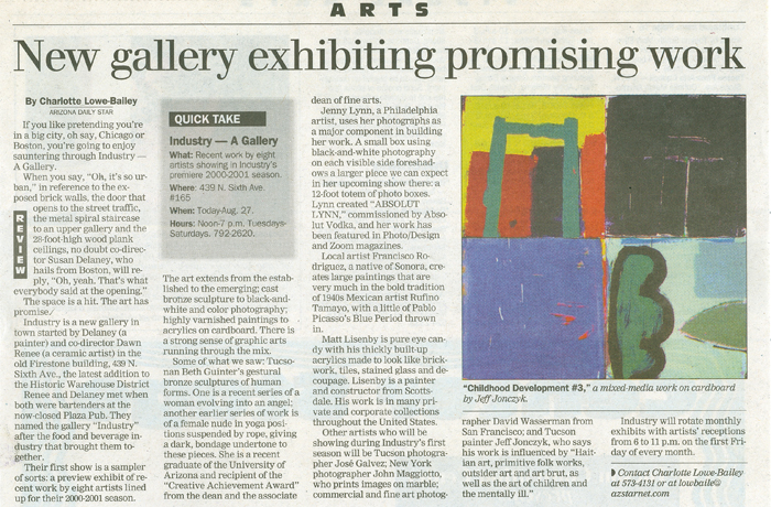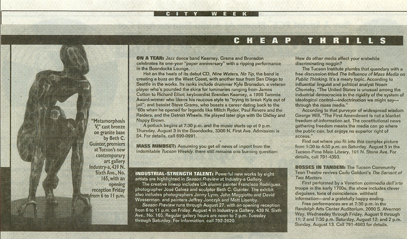 Tucson WeeklyCity Week-Cheap ThrillsINDUSTRIAL-STRENGTH TALENT: Powerful new works by eight artists are highlighted in Season Preview at Industry-a Gallery. The creative lineup includes UA alumni painter Francisco Rodriguez, photographer José Galvez and sculptor Beth C. Guinter. The exhibit also includes photographers Jenny Lynn, John Maggiotto and David Wasserman, and painters Jeffrey Jonczyk and Matt Lisenby. Season Preview runs through August 27, 2000 with an opening reception from 6 to 11 p.m. on Friday, August 4 in Industry-a Gallery, 439 N. Sixth Ave., No. 165. Regular gallery hours are noon to 7 p.m. Tuesday through Saturday. |